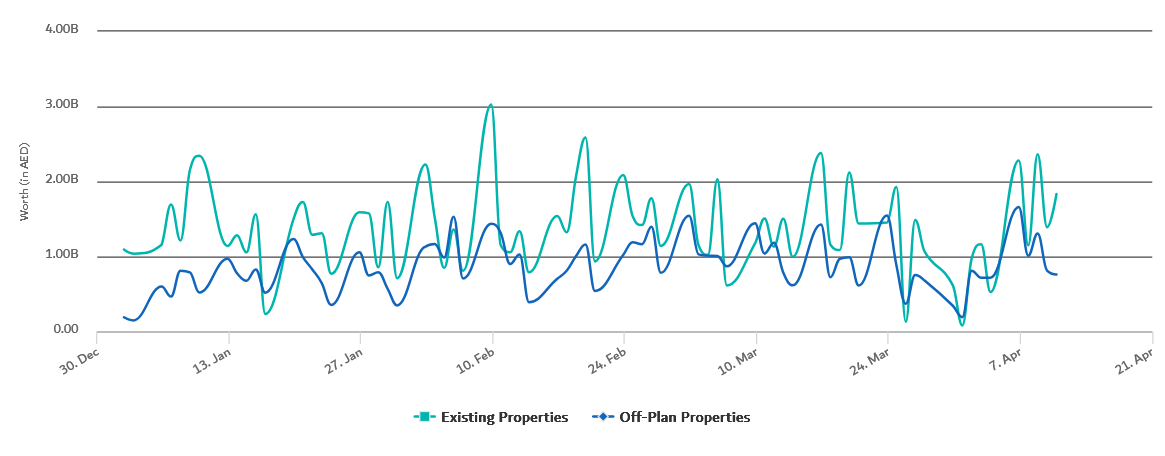 As a result, the total real estate transactions (sales + mortgages + gifts) during the first 101 days of the year reached AED 221.09 billion, spread across 64,838 deals.
