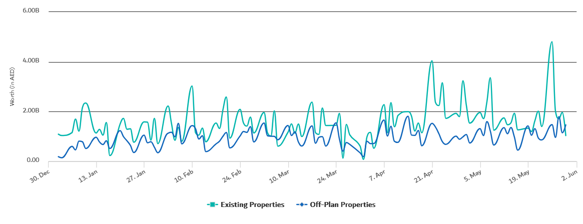 From the beginning of the year until the end of May, total real estate sales stood at AED 272.41 billion, including 62,826 residential units, 6,386 buildings, and 12,952 plots of land.